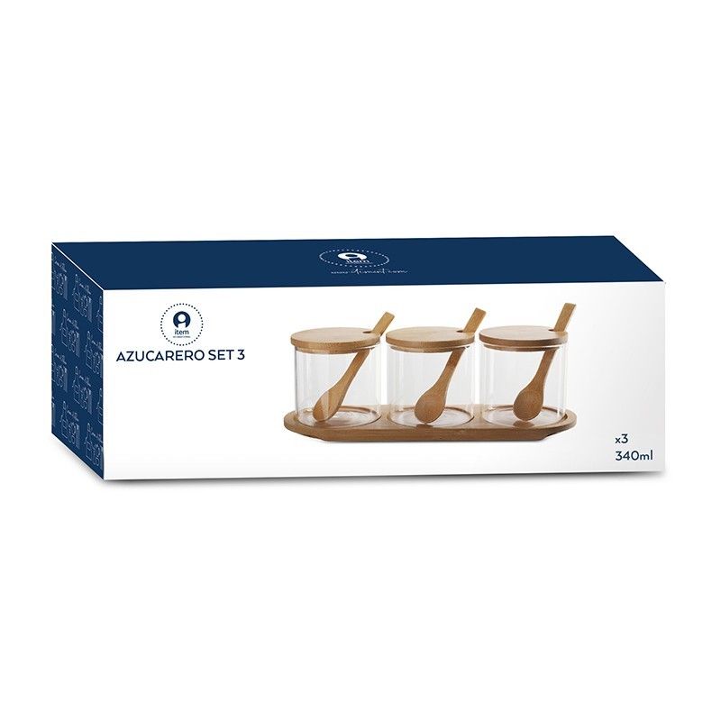 Set de 3 azucareros, 30 x 10 x 10 cm, de borosilicato y bambú en transparente